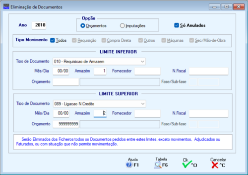 Indique o Ano para a eliminação de Documentos.