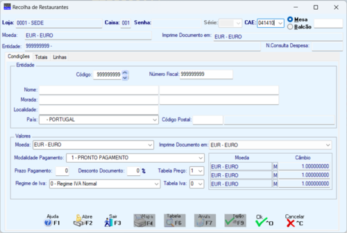 Se a Entidade for «0» (Zero) ou tiver o campo "Número Fiscal" preenchido com 999999999 no ficheiro de Entidades é pedida a recolha dos dados:
