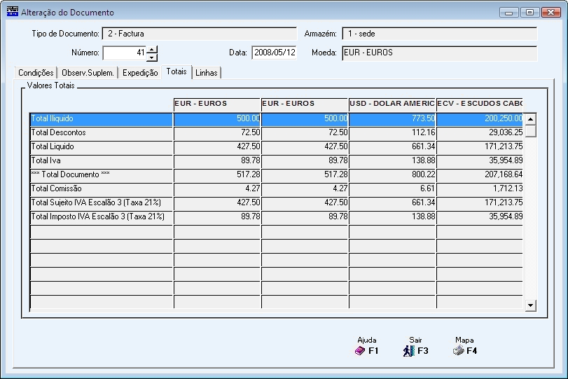 4 Colunas com valores Totais, onde a primeira coluna corresponde à Moeda do Documento e as restantes colunas às Moedas Principal, Secundária e Terciária, definidas na Configuração da Empresa.