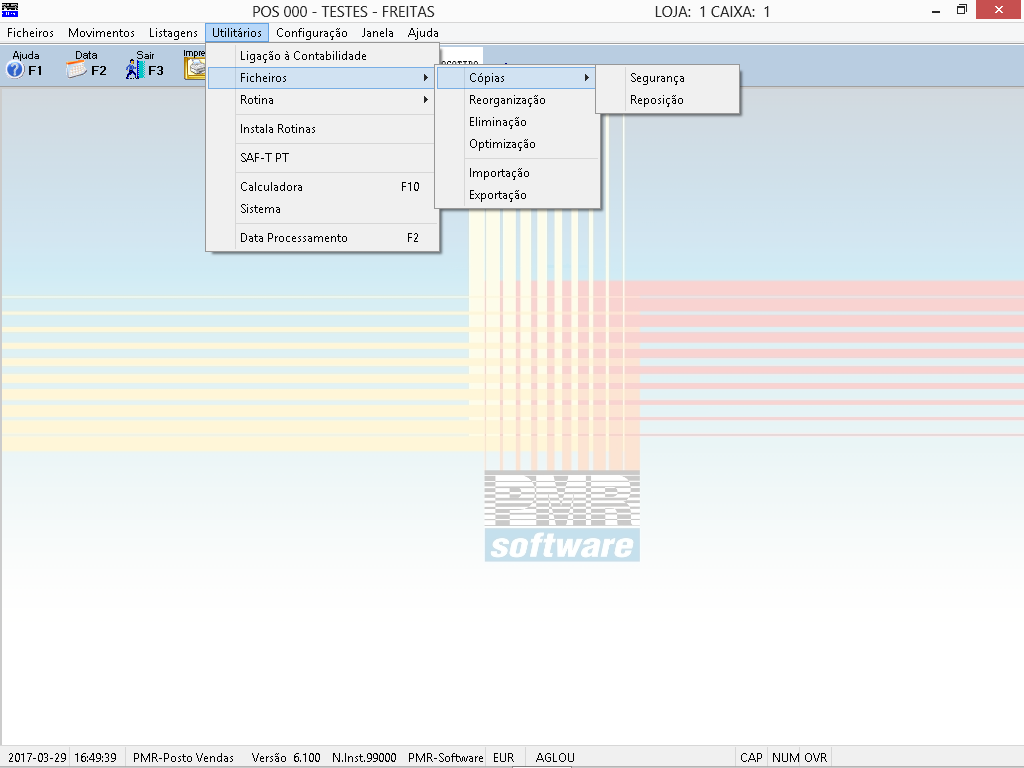 2.1- FICHEIROS - CÓPIAS SEGURANÇAS Operação de Cópia dos ficheiros do computador para um suporte externo. REPOSIÇÃO Funcionalidade desativada conforme portaria n.º 22A/2012 de 24 de Janeiro. Operação de Cópia dos Ficheiros do suporte externo para o computador de trabalho.