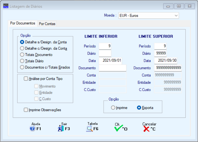 Indique se pretende a Emissão Completa dos Diários com ou sem Designação das Contas incluindo todas as linhas de lançamento, só Totais Documento ou só Totais Diário para efeitos de conferência.
