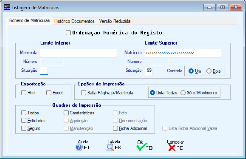 4.7- LISTAGENS DO FICHEIRO DE MATRÍCULAS Contêm três separadores: Ficheiro de Matrículas; Histórico dos Documentos; Versão Reduzida. Ficheiro de Matrículas Histórico dos Documentos Versão Reduzida