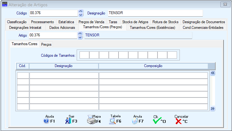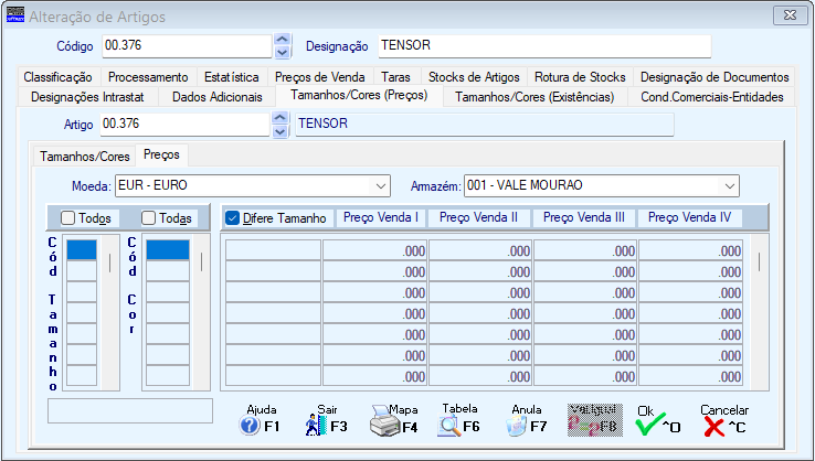 3.11- GESTÃO ARTIGOS - TAMANHOS/CORES (PREÇOS)Se o módulo opcional de PMR-Cores e Tamanhos estiver instalado, e o Artigo definido que usa estas opções, toda a Gestão de Recolha e Atualização de Stocks será feita nessa base, mais detalhadamente, sendo a existência final do Artigo fruto dos somatórios das movimentações dos Artigos por Cores e Tamanhos.