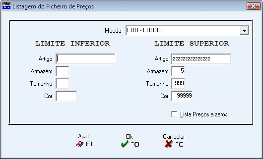 Através da lista pendente, indique o Código da Moeda para os Preços.