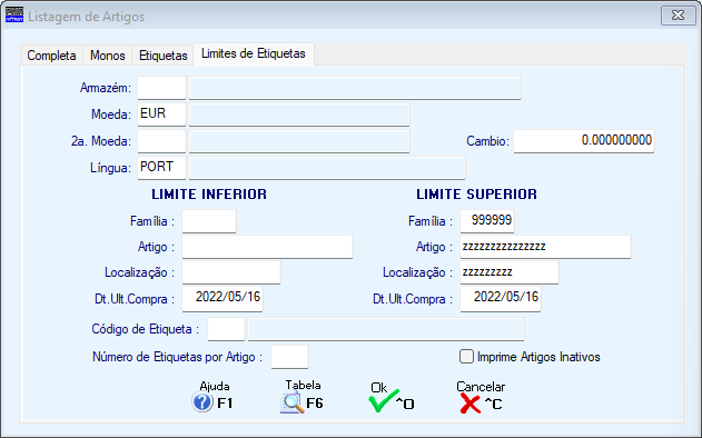 3.14.4- LIMITES DE ETIQUETASA recolha dos campos Armazém, Moeda, 2ª Moeda e Câmbio é semelhante ao preenchimento dos mesmos no ecrã anterior.